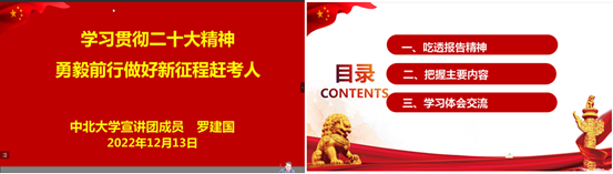 根据学校为进一步推动学习宣传贯彻党的二十大精神要求,12月13日下午,院党委书记罗建国对学院全体教职工和全体党员进行了“学习贯彻党的二十大精神 勇毅前行做好新征程赶考人”党的二十大精神宣讲活动。宣讲开篇点出了党的二十大精神宣讲是当前和今后一个时期的首要政治任务,接着从“吃透报告精神”、“把握主要内容”、“学习体会交流”三个方面进行了阐述。