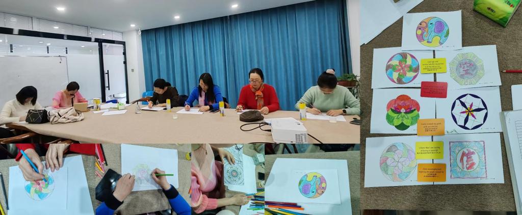 下午4:00—6:00学院的女教职工在大学生心理健康中心教师赵丹凤老师的指导下,完成了虚拟过山体验、舞动体验、曼陀罗绘画、心灵分享四项活动。