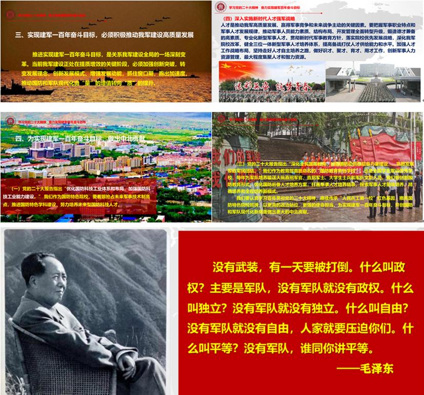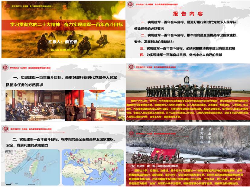 蔺老师开篇点出了党的二十大精神宣讲是当前和今后一个时期的首要政治任务,把“奋力实现建军一百年奋斗目标”作为宣讲党的二十大精神的切入点,从实现建军一百年奋斗目标,是更好履行新时代党赋予人民军队使命任务的必然要求、根本指向是全面提高捍卫国家主权、安全、发展利益的战略能力、必须积极推动我军建设高质量发展这三个方面对党的二十大报告中国防和军队现代化建设进行了深入的阐述,并结合实现建军一百年奋斗目标,中北人如何做出自己的贡献和大家进行了交流!
