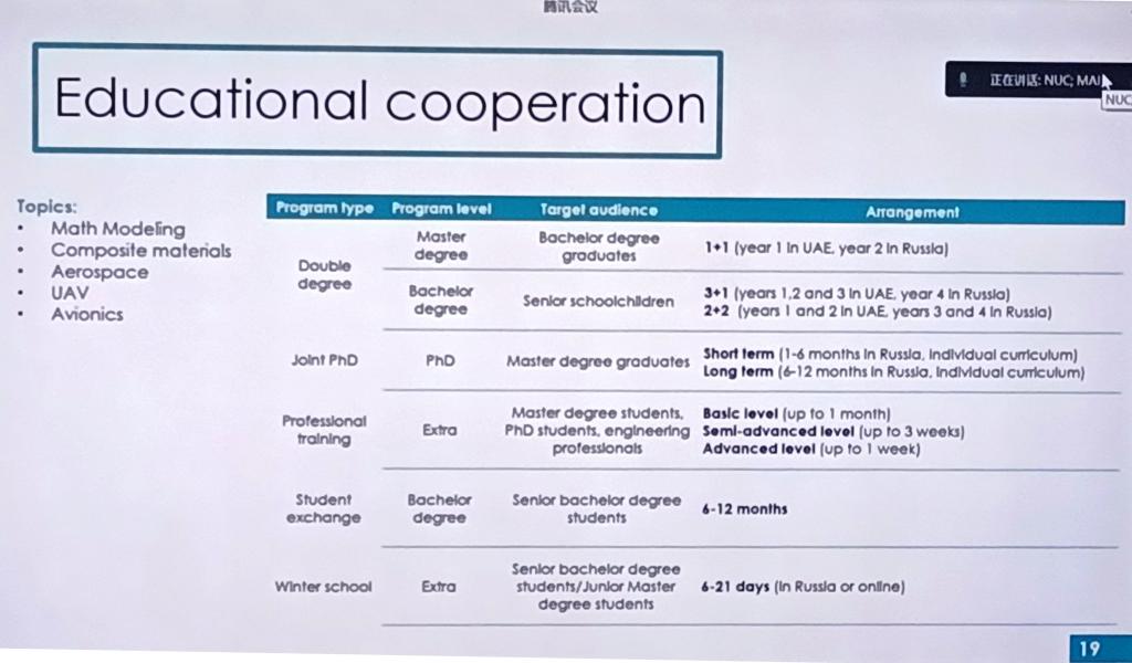 接下来,双方就联合培养学生的方式:航空航天夏令营、冬令营、访问学者、合作交流、联合办学等模式展开了积极的探讨,李京阳院长表示,莫斯科航空学院成立于1930年,是俄罗斯国立研究型大学,航空航天领域建树不胜枚举,对世界航空航天发展产生深远影响,地位举足轻重。莫航强调工程教育理念,把培养世界杰出的工程技术人才作为目标,注重对学生知识、技能、能力与实践的综合培养,是航空航天领域重要的人才培养基地。莫航对于我校发展与历史底蕴给予高度认可,希望未来能与我校建立密切合作关系,在航空航天领域加强交流沟通与师生共建,为两国在空天领域交流合作贡献力量。