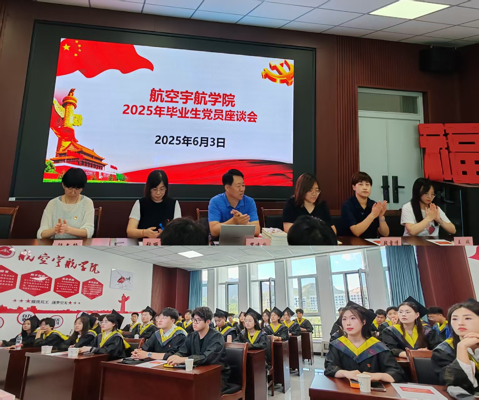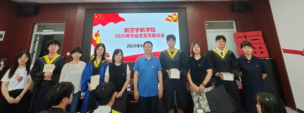 2025年6月3日下午,航空宇航学院在完成全体毕业生合影后,在学院楼310会议室举行2025届毕业生党员专题党课暨座谈会。学院党委书记罗建国、党委委员张丽花、各学生党支部书记及组织员出席会议,与全体毕业生党员进行深入交流。会议由张丽花老师主持。