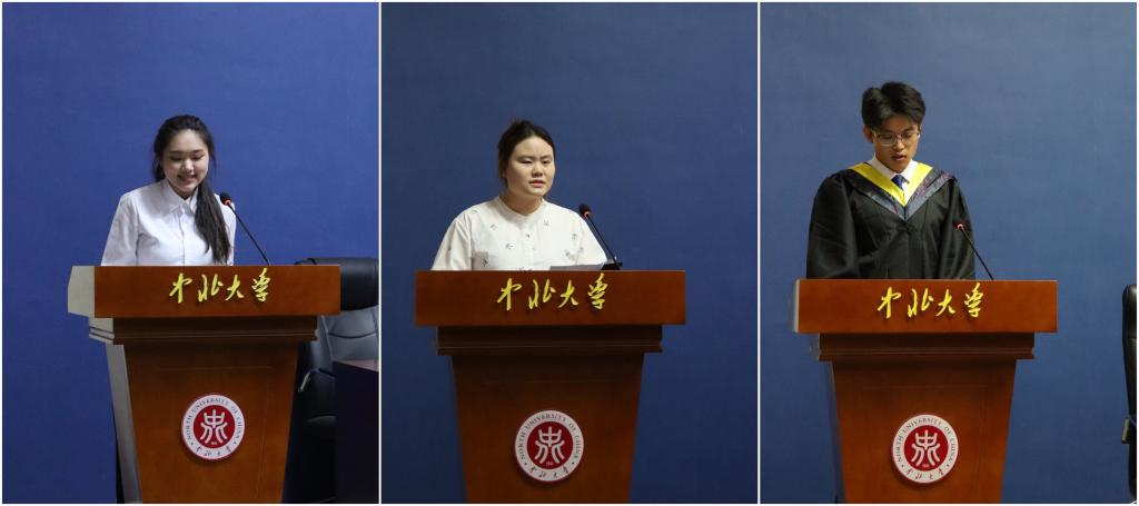 毕业生代表姚立腾同学迈着沉稳的步伐登台发言。他满怀感恩之情,向老师们四年来对毕业生的辛勤培育表达了最衷心的感谢。回顾大学四年,他感慨时光飞逝,那些在实验室里埋头钻研的日子、在图书馆中挑灯夜读的时光、与同学们并肩作战的瞬间,都如同电影般在他脑海中一一闪过。他表示,此次毕业典礼不仅是一场与过去的告别,更是一个崭新征程的起点,激励着毕业生们勇敢迈向未来。在校生代表高嫣然同学也上台发言。她向即将踏上新征途的毕业生们致以最热烈的祝贺,同时向辛勤耕耘、无私奉献的老师们致以最崇高的敬意。她呼吁在校生们珍惜宝贵的校园时光,努力学习专业知识,积极参与社会实践,不断锤炼自我、提升自我,为未来步入社会筑牢坚实根基,努力成长为国家和社会的中流砥柱。