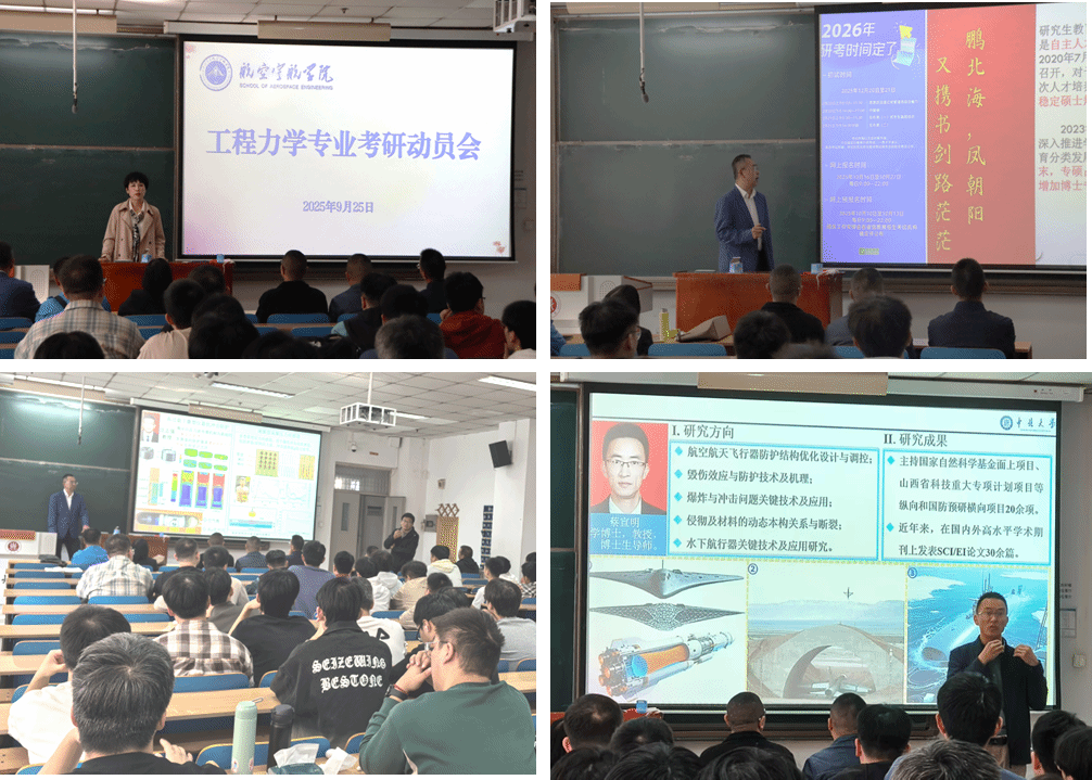 为助力航空宇航学院工程力学专业2022级学子精准把握考研形势、明确备考方向,我院于2025年9月25日下午在11105H教室成功举办工程力学专业考研动员暨导师交流会。本次会议汇聚了学院副院长徐鹏、工程力学系主任、年级班主任、青年学术带头人及近十位研究生导师,面向2022级全体工程力学专业学生,围绕考研政策、学科实力、导师资源与复习策略四大模块展开深入交流,为学生搭建从备考到学术深造的有效桥梁。