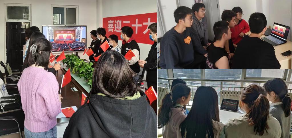 在学院会议室,院党委书记罗建国、党委副书记史瑞根与标杆党支部的全体师生党员一同收看了党的二十大开幕会直播盛况。全院各班级把收看党的二十大开幕会直播作为重要的思想政治教育契机,在辅导员、班主任老师的带领下,同学们以宿舍为小组在宿舍集中收看直播实况,并在直播结束后展开热烈讨论,热议习近平总书记代表十九届中央委员会向大会所作的报告,畅谈了他们激动的心情和催人奋进的感想。因疫情阻隔暂未返校的教职工居家认真收看了党的二十大开幕会直播,纷纷以激动的心情向学院发回收看直播的照片和视频,表达他们共享盛会的喜悦。