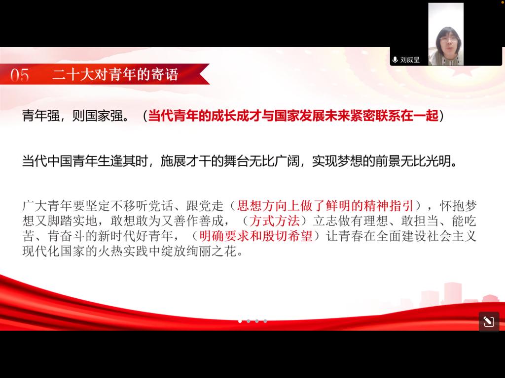 为深入学习宣传贯彻二十大精神的深刻内涵和精神要义,飞行器制造工程专业党支部于2022年11月27日19:30召开线上会议。本次会议由支部副书记鲍芃荣同志主持,张丽花老师,党支部书记段雪倩老师,以及支部全体同志参加。