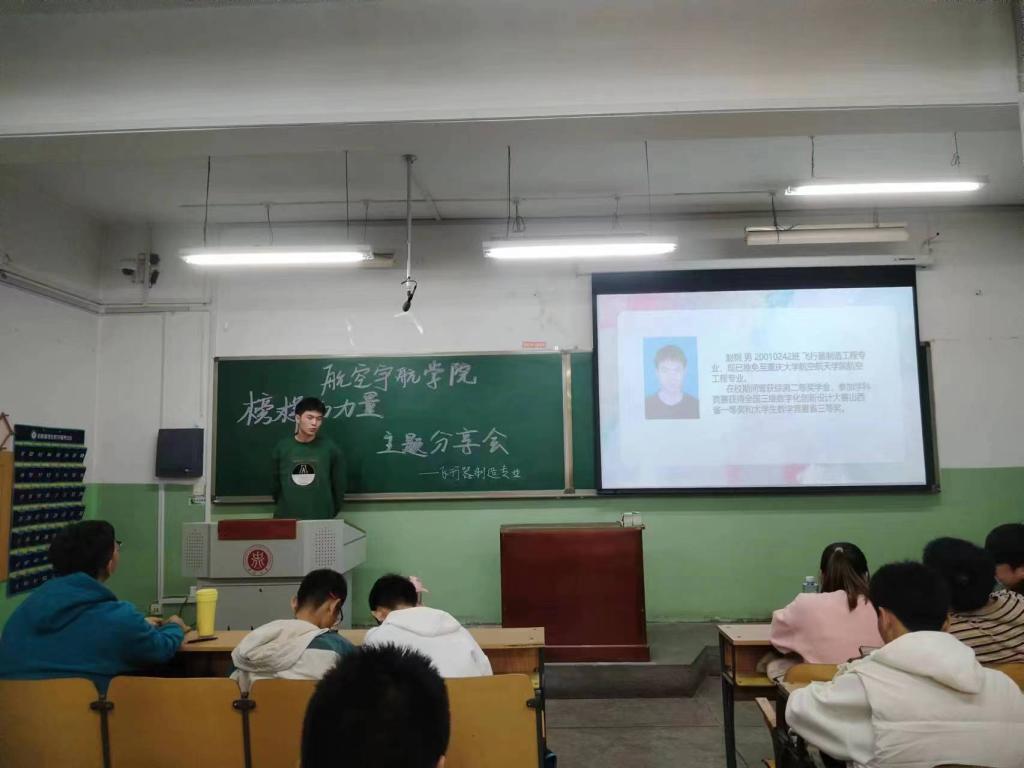 为充分发挥优秀学生成长导向作用,帮助初入大学的学生更好地适应大学学习、生活节奏,10月13日上午,武威壮、刘鑫、弓亚龙、武承芸、赵翔翔、赵刚6名飞行器制造专业优秀学生代表应邀在1号教学楼参加“榜样的力量”经验分享交流会。