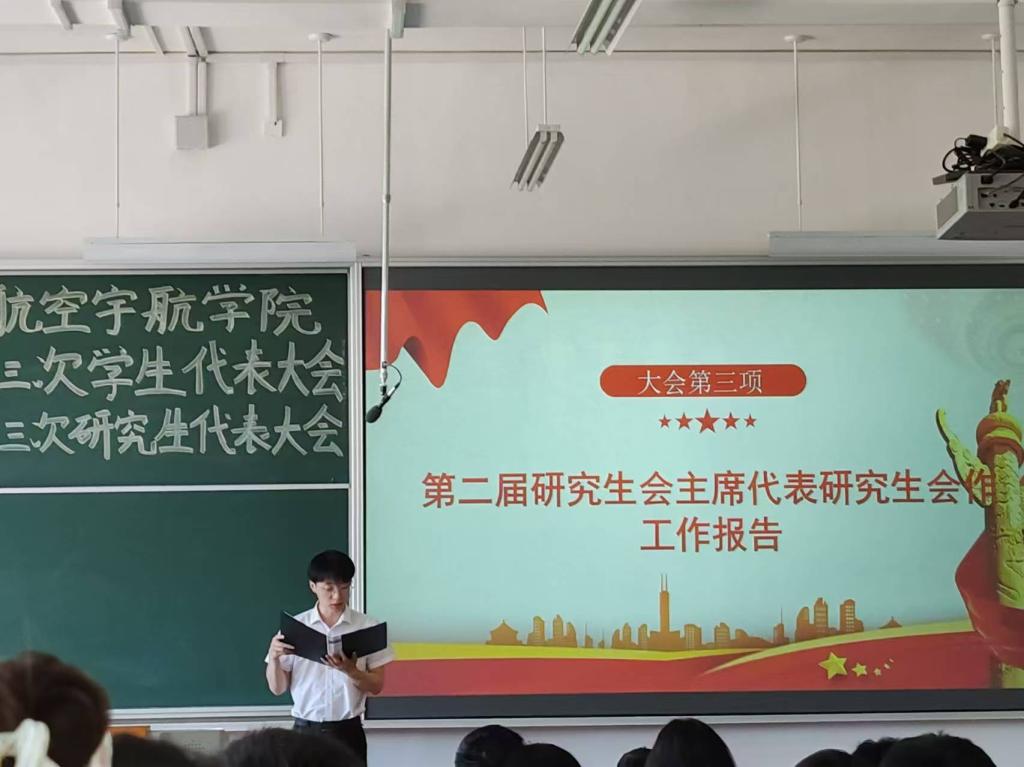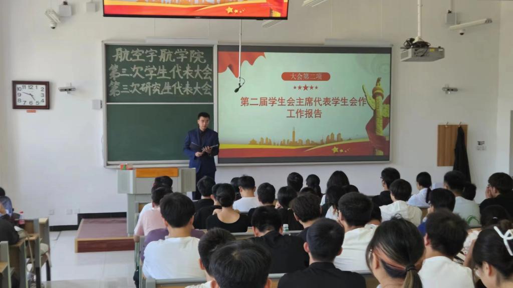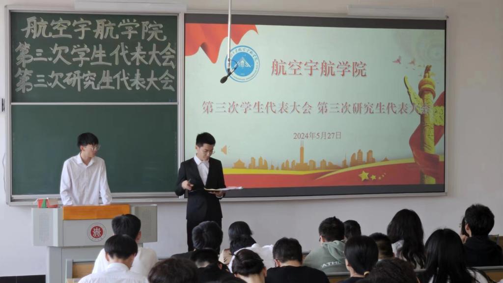 航空宇航学院第三次学生代表大会、第三次研究生代表大会于2024年5月27日在17102H召开。会议由第二届学生会主席团成员张润泽主持,学院团委书记王月花,团委副书记王姣,辅导员李国平老师及各班学生代表出席大会。