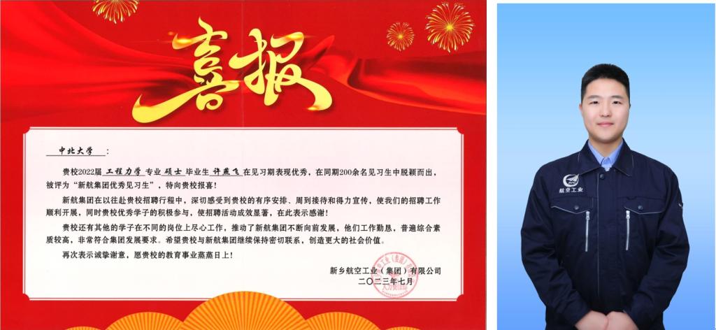 近日,新乡航空工业(集团)有限公司向我校发来喜报。喜报提及,我校2022届工程力学专业硕士毕业生许燕飞在见习期表现优秀,在同期200余名见习生中脱颖而出,被评为“新航集团优秀见习生”,特向我校报喜。这是国家大型骨干航空企业对中北大学研究生培养工作的高度肯定。