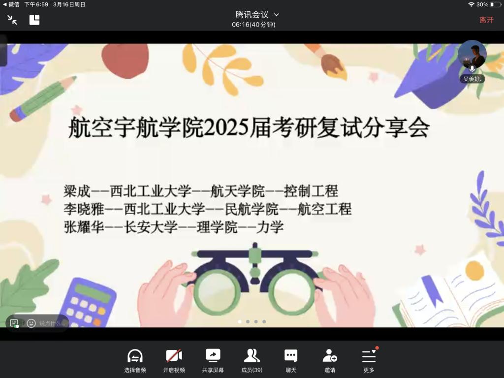 为帮助2025届毕业生全面掌握考研复试技巧,提升综合竞争力,3月16日晚,航空宇航学院通过腾讯会议平台开展了考研复试分享会,吸引了众多备考学子参与,现场气氛热烈。