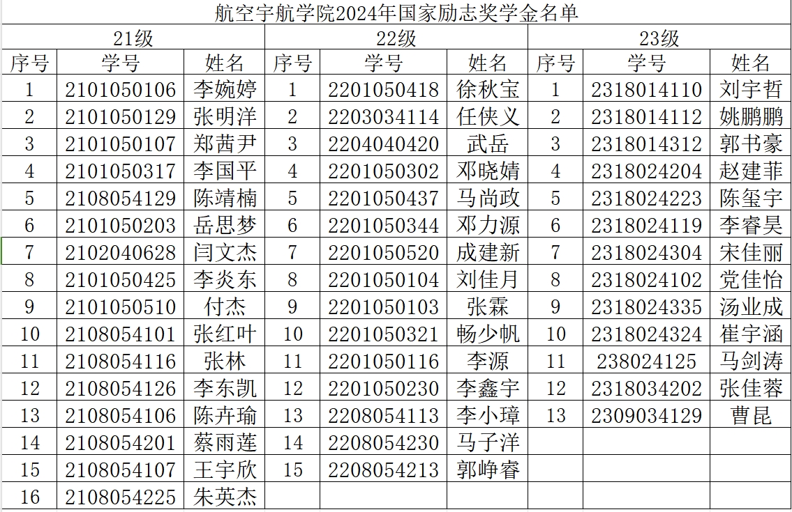 航空宇航学院2024年国家励志奖学金名单公示