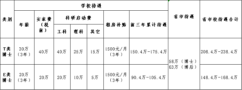 教学科研岗位招聘博士采用综合评价的方式,依据学历背景、学术水平、学院评价划分为T类、E类。学校为两类博士提供待遇如下: